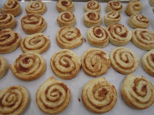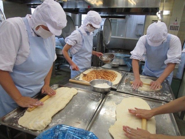 ■今日のパンは、給食室で生地から手作りした「手作りアップルシナモンパン」です。朝から調理さんが一生懸命こねて、成形して焼いてくれました。「シナモン」は甘い香りが特徴のスパイスです。世界最古のスパイスともいわれ、「スパイスの王様」ともいわれています。今日の給食は全体的に子供たちに人気でしたが、特に「パンおいしかった!」「サラダもおいしかったです!」と言ってくれているクラスが多かったです。