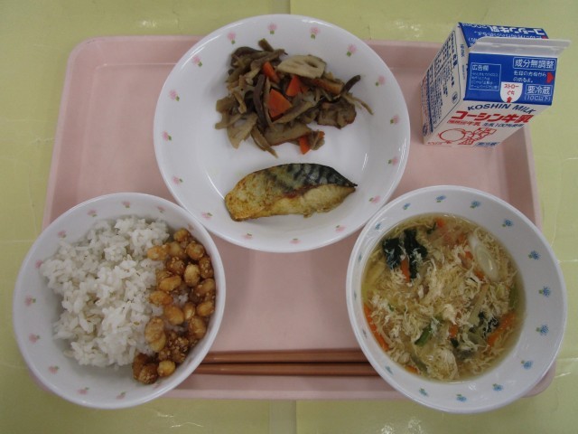 ごはん・揚げ大豆のごまがらめ・鯖のカレー焼き・ごぼうとれんこんのみそ炒め・千切り野菜のかきたま汁・牛乳