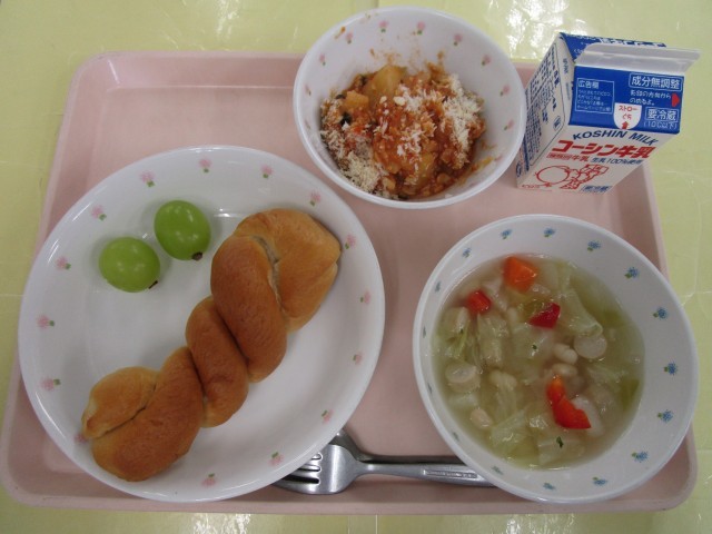 米粉パン・ムサカ(ブルガリアのグラタン)・ボブチョルバ(いんげん豆のスープ)・ぶどう・牛乳