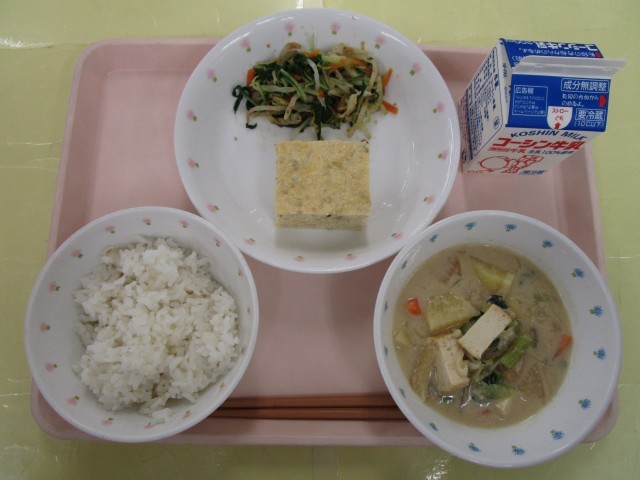 ごはん・五目たまご焼き・水菜のおかか和え・ごま豆乳みそ汁・牛乳