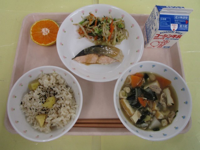栗ごはん・マスの塩こうじ焼き西京みそかけ・キャベツと小松菜のお浸し・のっぺい汁・みかん・牛乳