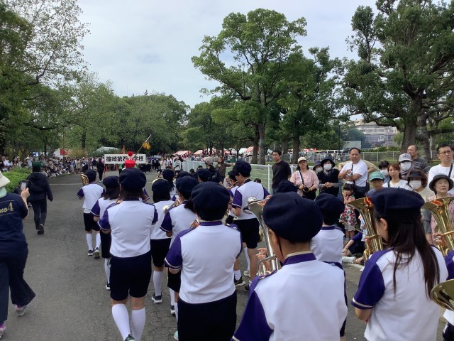 体育学習発表会で披露した「ボギー大佐」「篠崎第四小学校校歌」「キセキ」に加え、新曲の「名探偵コナンメインテーマ」の4曲を演奏しながら、公園内をパレードしました。夏休み練習にも熱心に取り組み、その成果を十分出し切ることができたようです。