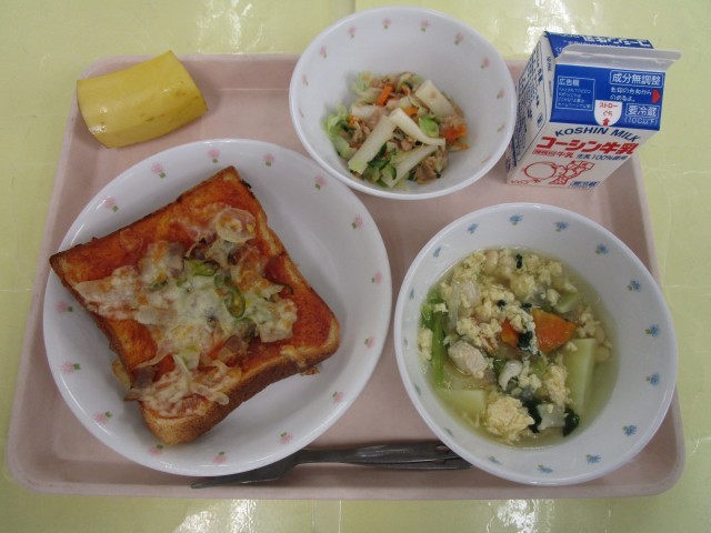 ピザトースト・チキンとたまごのスープ煮・米粉マカロニサラダ・バナナ・牛乳