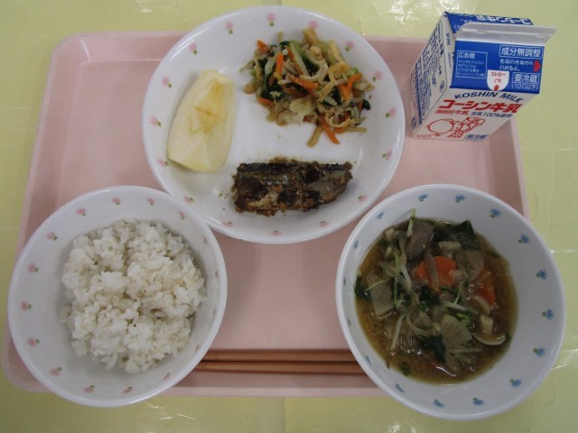 ごはん・秋刀魚の松前煮・カリカリ油揚げとキャベツのごま和え・具沢山みそ汁・りんご・牛乳