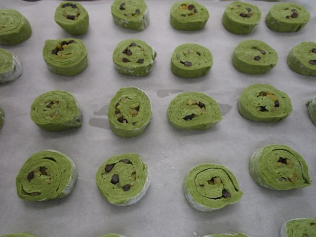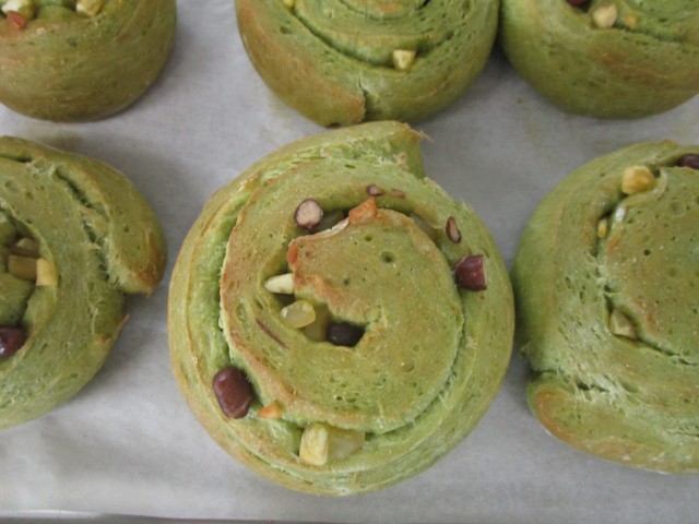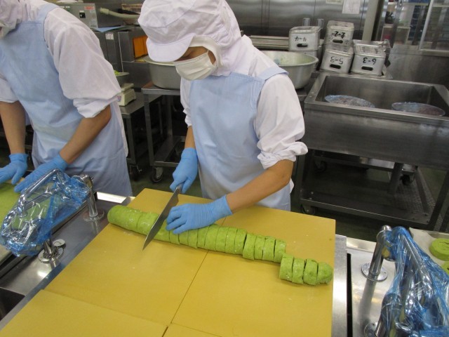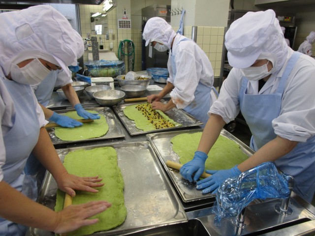 ■今日のパンは給食室で生地から手作りした「手作り抹茶栗パン」です。生地に抹茶を加え、栗と甘納豆を包んで焼き上げて仕上げました。「抹茶」は、日本に起源をもつ粉末状の緑茶であり、鮮やかな緑色で、うま味のもとであるテアニンなどのアミノ酸が増えて風味が増します。今日のパンは抹茶の香りがして、栗と甘納豆の甘みがやさしいパンになりました。子供たちも甘納豆と栗おいしい!と言っている子もいて好評でした。