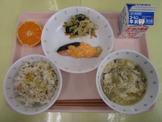 菊花ごはん・マスのもみじ焼き・小松菜のごま和え・豆腐ともずくのかきたま汁・菊花みかん・牛乳