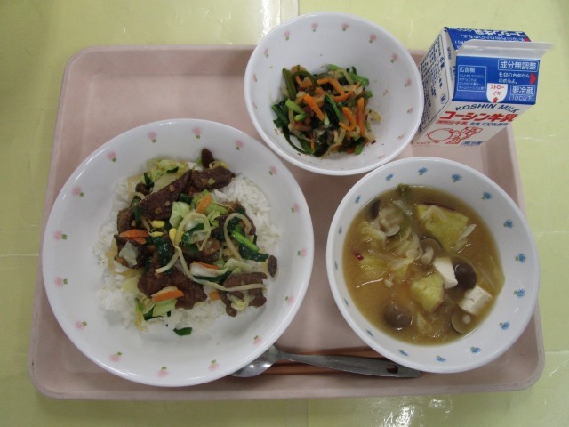 レバーのスタミナ丼・茎わかめの和え物・根菜ときのこのみそ汁・牛乳