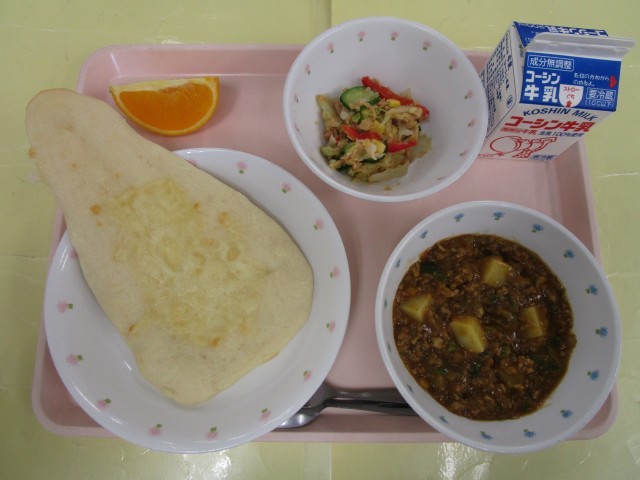 焼きチーズナン・キーマカレー・にんじんドレッシングサラダ・オレンジ・牛乳