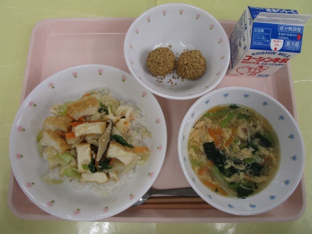 家常豆腐丼・小松菜とたまごの中華スープ・さつまいものごま団子・牛乳