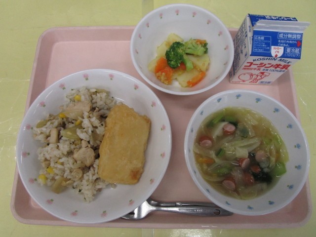 鶏ときのこのピラフ・イカのカリカリ揚げ・アーモンド入りカレーポテトサラダ・キャベツとレンズ豆のスープ・牛乳