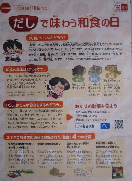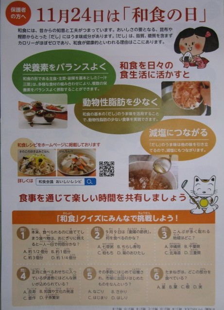 ■11月24日は、和食の日です。『日本の自然から生まれ、歴史の中で育まれたわたしたちの和食文化「和食」を理解し、和食の味の基本である「だし」を味わいましょう。』という日です。2013年12月にユネスコ無形文化遺産に登録されています。今日の給食は大分県の郷土料理にしました。だんご汁は、たくさんの旬の野菜を加えてみそ味に仕上げています。だんごには小麦粉を使い、耳たぶくらいのかたさになるようにこねて、生地を伸ばして汁に加えました。また、「みんなの給食」と題してSDGsを考えるきっかけになるような献立にもしています。食材を無駄にしない工夫、和食、行事食や郷土料理、残菜、みんなが安全に食べられる、食事ができることへの感謝をテーマにしています。身近なことからひとりひとりできることを考えてもらうきっかけになってもらえればと思います。今日は、とり天が子供たちのとても人気で、「おかわりほしい!」「もっと食べたい!」と言っているクラスが多かったです。