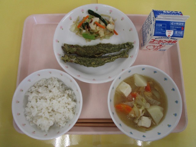 ごはん・ししゃもの磯辺揚げ・大根とちくわの甘酢和え・白菜と油揚げのみそ汁・牛乳