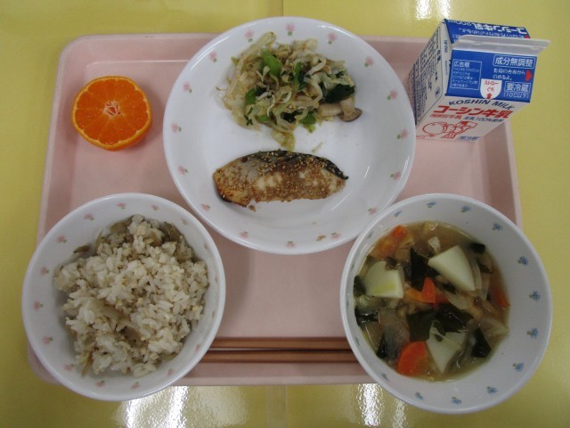 そぼろごぼうごはん・鯖のごま焼き・小松菜としらすの和え物・じゃが芋とわかめのみそ汁・みかん・牛乳
