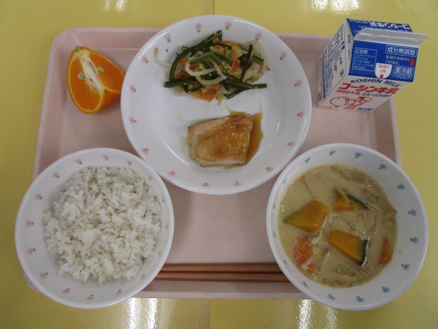 ■「早香」とは、いつも給食で提供している「温州みかん」と「ぽんかん」というみかんの特徴をもってうまれたみかんです。温州みかんからは果汁の多さ、ぽんかんからは強い甘みを受け継いでいます。皮が薄くてむきやすいのも特徴のひとつです。味わって食べてみてくださいね。今日は、鶏肉のタレをごはんにもつけて食べている子も多くみられました。最近ごはんの残菜が増えているので、食べ方を工夫してよく食べてもらえたらと思います。