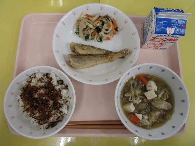 ごはん・おかかふりかけ・はたはたのから揚げ・小松菜のみそ和え・じゃぶ・牛乳