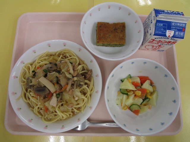 ツナときのこの和風スパゲティ・ポテトサラダ・小松菜ケーキ・牛乳