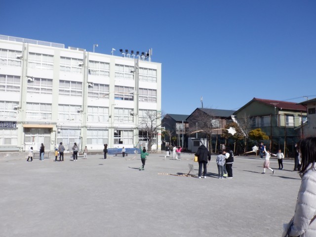 翌日の1月31日(土)には、校庭で各クラスごとに凧揚げ大会を行いました。土曜日授業のため、保護者の方も一緒に参加していただきました。比較的風が強かったため、大空に上がった凧を見て子どもたちは歓声を上げていました。