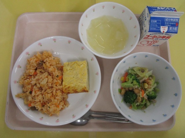 チキンライス・チーズ入りポテトオムレツ・カリカリ大豆と海藻のごまドレサラダ・アップル寒天・牛乳