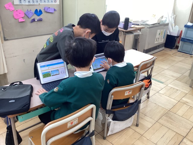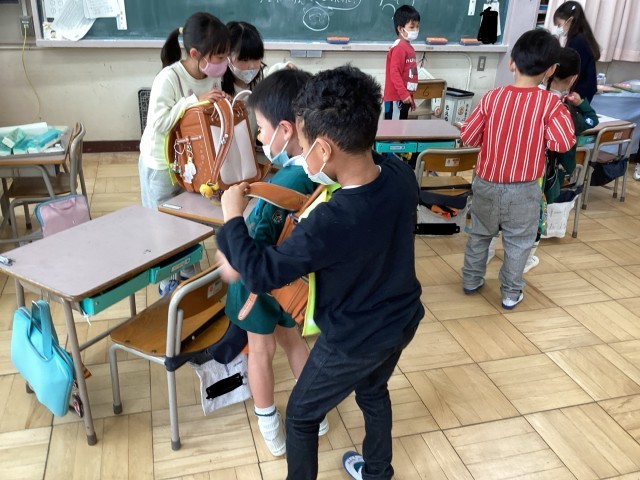 1年生が4月から小学校に入学予定の園児へ向けて「小学校でできる楽しかったこと」を絵と言葉で紹介しました。また、小学校体験を園児たちに提案し、ミニ体験会もしました。幼稚園の子たちに、中身が入った重いランドセルを背負ってもらったり、タブレットを触らせてあげたり、給食のお盆を持って歩いたり、グループごとに内容を考えて活動しました。きっと小学校へのイメージができたことと思います。