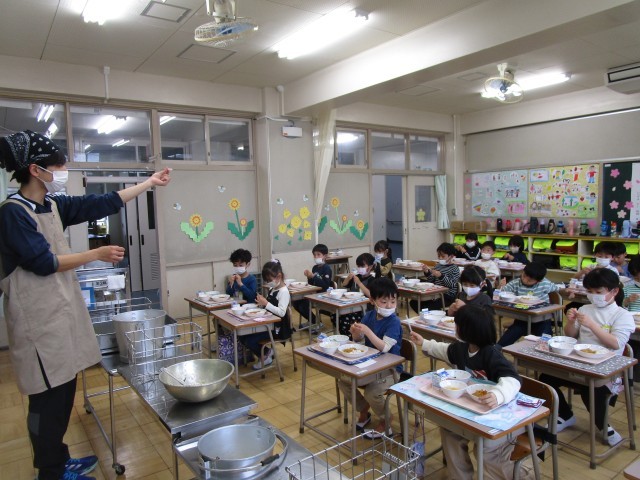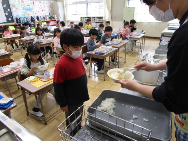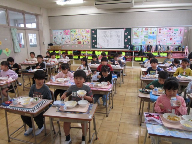 今日から給食が始まりました。学校給食は、子供たちが元気に成長するために必要な栄養がたくさん入っています。苦手な食材や食べたことのないメニューもあるかもしれませんがひと口はチャレンジしてください。給食を通して「食べること」に興味をもってもらえると嬉しいです。1年生も今日から始まりました。先生の話をよく聞いて、しっかりと給食準備をしてくれていました。「おいしい!」「この食材苦手だけど、食べてみたら食べられた!」と言っていて、おかわりまでしてくれている子もいました。こばとさんたちも「全部おいしかった!」「おかわりもあるの?」と言ってくれて、もりもり食べてくれていました。今後もしっかりと食べてくれればと思います。