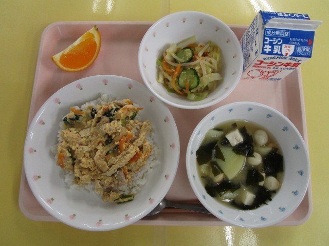 あぶ玉丼・キャベツのピリ辛漬け・お麩入りみそ汁・清見オレンジ・牛乳