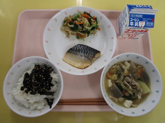 ごはん・のりふりかけ・鯖の塩こうじ焼き・白菜のいおかか和え・豚汁・牛乳