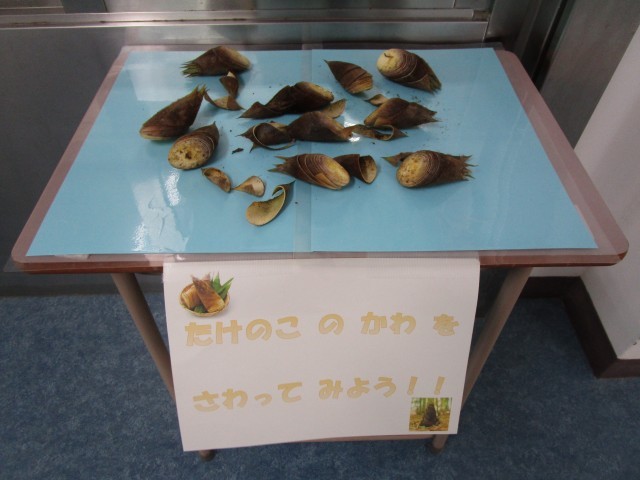 ■今日の「たけのこごはん」のたけのこは、生のたけのこを注文し、給食室で下処理しました。たけのこは10日ほどであっという間に竹になってしまうほど成長が早いです。生のたけのこは、今の時期にしか食べることができないので味わって食べてください。今年も給食室の前に「たけのこ」を置きました。子供たちは、休み時間に触ったり、皮をむいてみたりと興味を示してくれていました。今日の「たけのこ」は石川県産です。