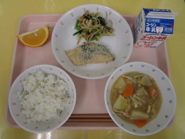 ごはん・マスのさざれ焼き・小松菜のごま和え・五目みそ汁・甘夏みかん・牛乳