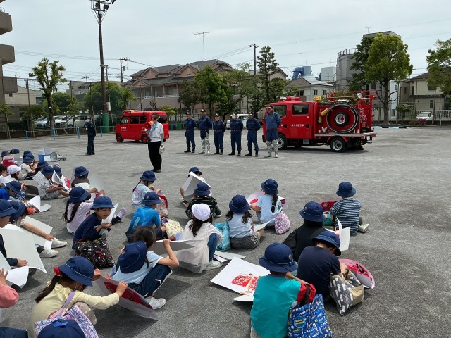 消防士さんからお話を聞いた後、子どもたちは思い思いの場所から、真剣な表情でクレパスを動かしていました。少し風の強い日でしたが、力強く大きな車体を描く子、細かなホースの部分にこだわる子など、一人ひとりの個性が光る作品が仕上がりました。後日、教室廊下に掲示しますので、ぜひご覧ください。