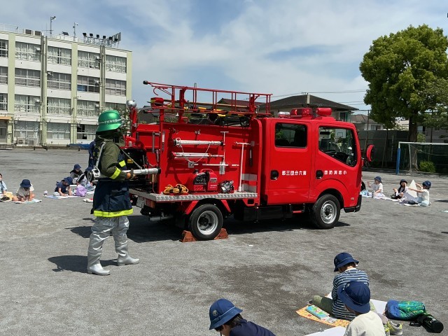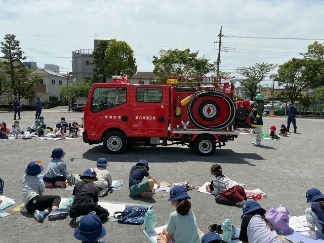 朝から「消防車はいつ来るの?」とワクワクしていた子どもたち。校庭に真っ赤な消防車が入っていくると、「わあ、かっこいい」と大きな歓声が上がりました。