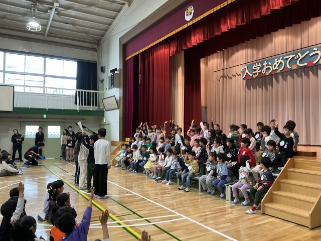 お兄さんお姉さんたちから篠四小学校の○×クイズや校歌をプレゼントしていただいたお礼に、1年生も、大きな声で言葉を言ったり「どきどきどん1年生」の歌を元気よく歌ったりすることができました。
