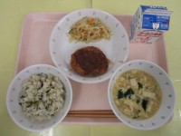 ごはん・厚焼きたまご・小松菜とツナの磯和え・じゃが芋と厚揚げのみそ汁・りんご・牛乳