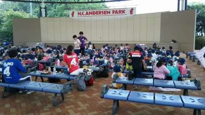 お弁当を食べています。雨がたくさん降っています。そういえば、去年の生活科見学もどしゃ降りでした。