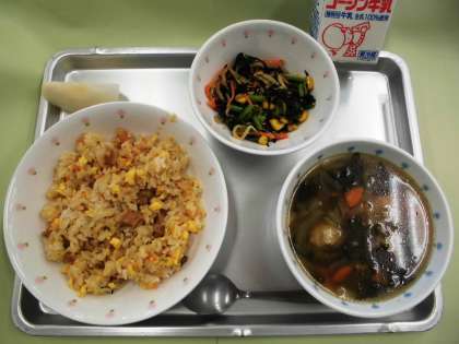 ごま油とサラダ油でねぎをじっくり加熱して、香りを油に移したねぎ油を使ってチャーハンを作りました。チャーハンは、子供たちにも人気があります。