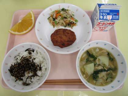 ごはん・ごまひじきふりかけ・とび魚のさつま揚げ(長いも)・茎わかめと大根の和え物・キャベツのみそ汁・美生柑・牛乳