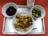 スタミナマーボー丼 牛乳 きのこのピリ辛あえ ぶどう寒天 豆腐のほかに、細かく切...