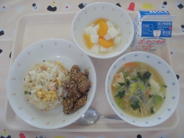 令和8年1月16日(金)【献立】鮭とたまごのチャーハン飲用牛乳レバーのごまがらめ...