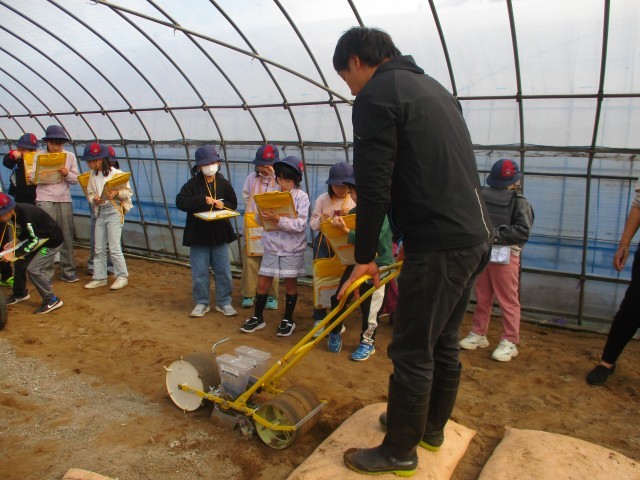 3年生が、小松菜農家さんの畑を見学させていただきました。小松菜をどのように育てているか、農家さんからお話を聞いたり、機械を見たりするなどして学習しました。農家さんがたくさんの努力をしているから、おいしい小松菜になることを発見することができました。