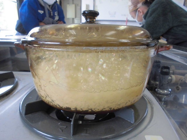 5年生は、家庭科の学習でお米炊きに挑戦しました。お米や水をしっかり計量し、水にしばらく浸していざ炊飯へ。学校では炊飯の様子がよく見られるようにガラス鍋を使って学習します。お米の様子や水の様子が刻々と変わるよう様子に子供たちも興味津々でした。