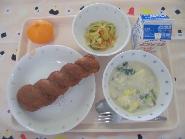 今日は、油で揚げたパンにココアと砂糖をまぶした「ココア揚げパン」を作りました。揚げパンが給食のメニューとして提供されるようになったのは、今から60年以上も前のことだと言われています。最初は、硬くなったパンを美味しく食べる方法としてパンを油で揚げ、砂糖をまぶしたのが始まりとされています。