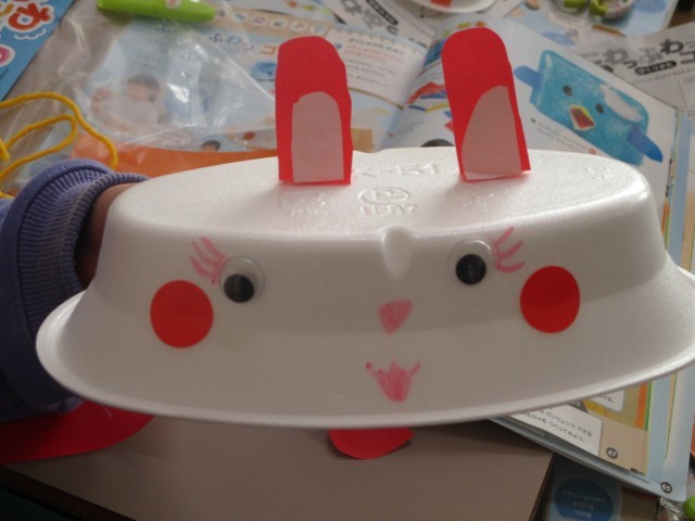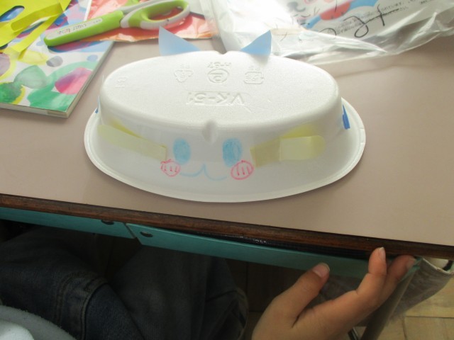本日、図工の学習で楕円型のスチレントレーを使って各々好きな生き物、乗り物を作りました。