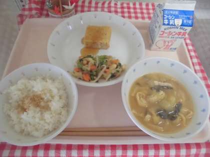 今日の主菜は、みたらし風のタレをかけた「和風ミートローフ」です!ミートローフは背の高い型に肉だねを流して焼き、切り分けて食べる料理です。給食では、豆腐や野菜をたっぷり使い、鶏のひき肉に混ぜて作ります。ヘルシーなミートローフに仕上がりました。