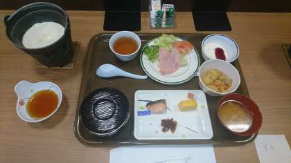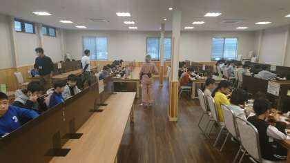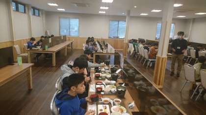 全員朝会で今日の目標を確認して、朝食です。元気ハツラツの一日に向けて、しっかりと腹ごしらえしています。