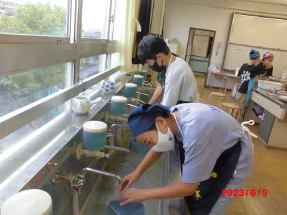 6年生が家庭科で「お茶を入れる、べっこう飴をつくる」学習を行いました。コロナ感染症のためこれまでできなかった調理実習がようやくできることになり、子供たちはこの日をとても楽しみにしていました。入れたお茶を飲みながら友達と団らんする時間は、ほんわりとした温かい時間となっていました。後片付けも協力してできました。