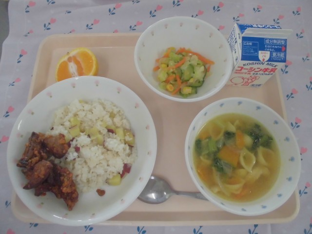 令和7年10月27日(月)【献立】さつまいものピラフ飲用牛乳レバーのケチャップソ...