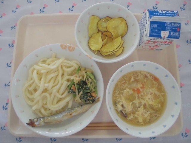令和7年11月27日(木)【献立】親子うどん飲用牛乳ししゃもの一味マヨ醤油焼き小...