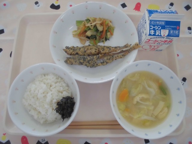 令和8年4月20日(月)【献立】ごはん海苔の佃煮飲用牛乳ししゃもの石垣揚げちくわ...