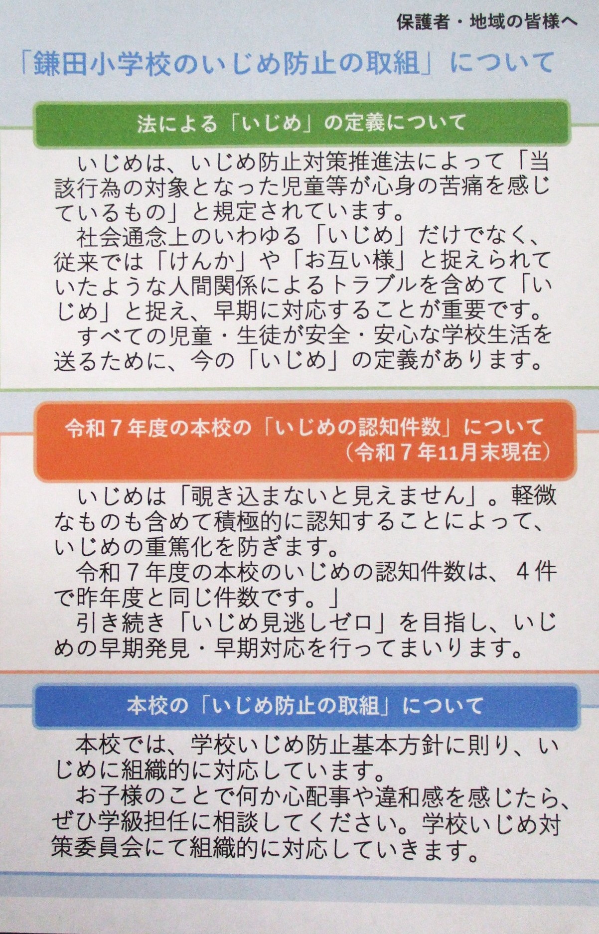 今年度の「鎌田小学校のいじめ防止の取組」について