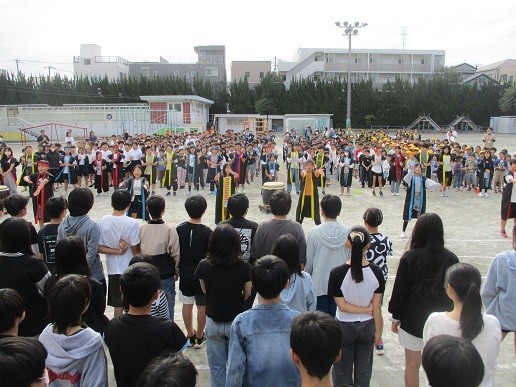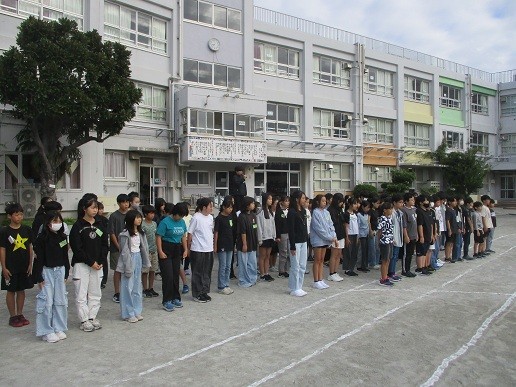 学校の代表として明日の体育大会に出場する6年生へ全校でエールを送りました。出場種目について発表し決意表明する6年生の態度もすばらしく、きりっと引き締まった一週間の始まりとなりました。何よりも6年生一人一人が自己記録更新を目指して頑張ってほしいと思います。フレーッ! フレーッ! 6年