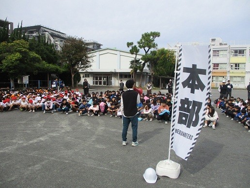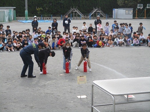 朝は集会委員に合わせて全校で「Bling-Bang-Bang-Born」を踊りました。寒くなってきたのでちょうどよい運動ができました。10月の避難訓練は、緊急地震速報が鳴ったらどのように行動するかを実践しました。小岩消防署の方に来ていただき、代表児童による消火器訓練も行いました。